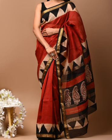 Hand block printed Maheswari silk sarees with printed blouse