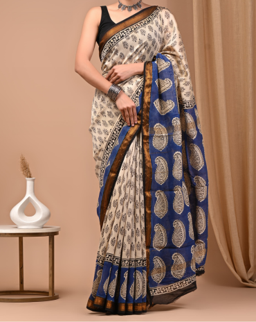 Bagru Block Print Cotton mulmul sarees with printed blouse